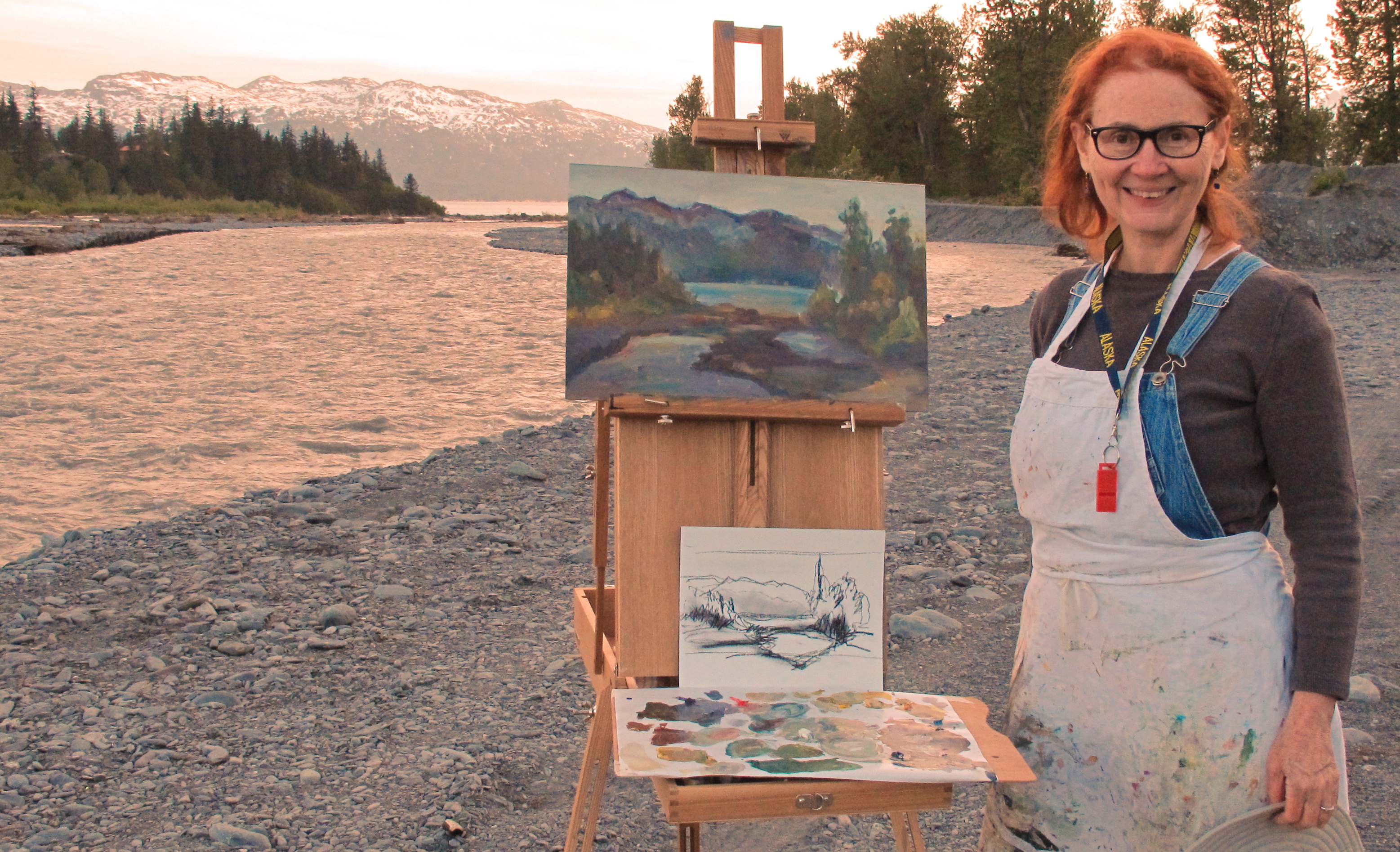 Since it has been a few years since she painted outdoors, Faith was thrilled to re-engage in plein air painting. She took time to scout out some good painting sites beforehand, so we were on our way to the Mineral Creek tributary by 8:00 p.m. the day I arrived. Alaskan painters enjoy one great advantage—about 19 to 20 hours of good daylight daily in the summer. Of course, that means that the corresponding winter demands the best in nocturnal painting!