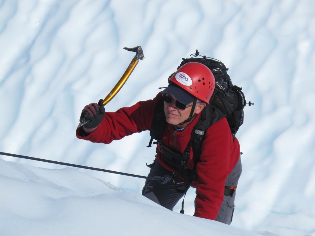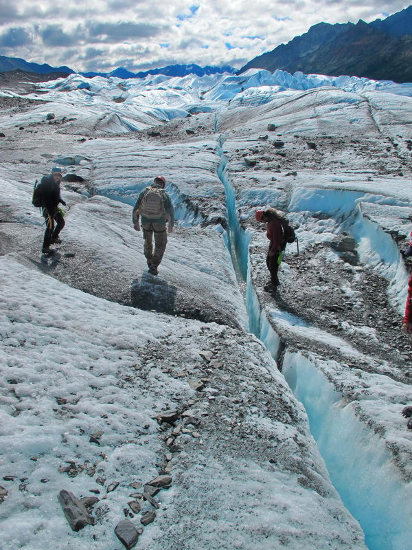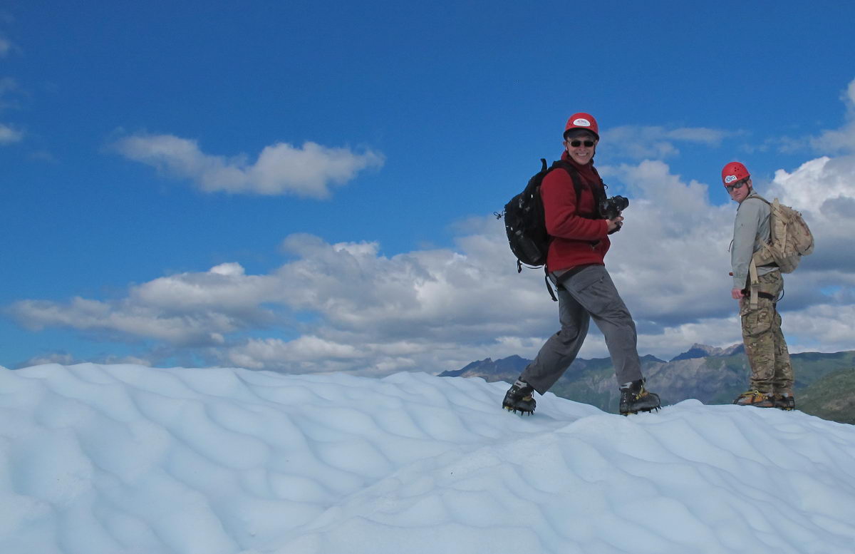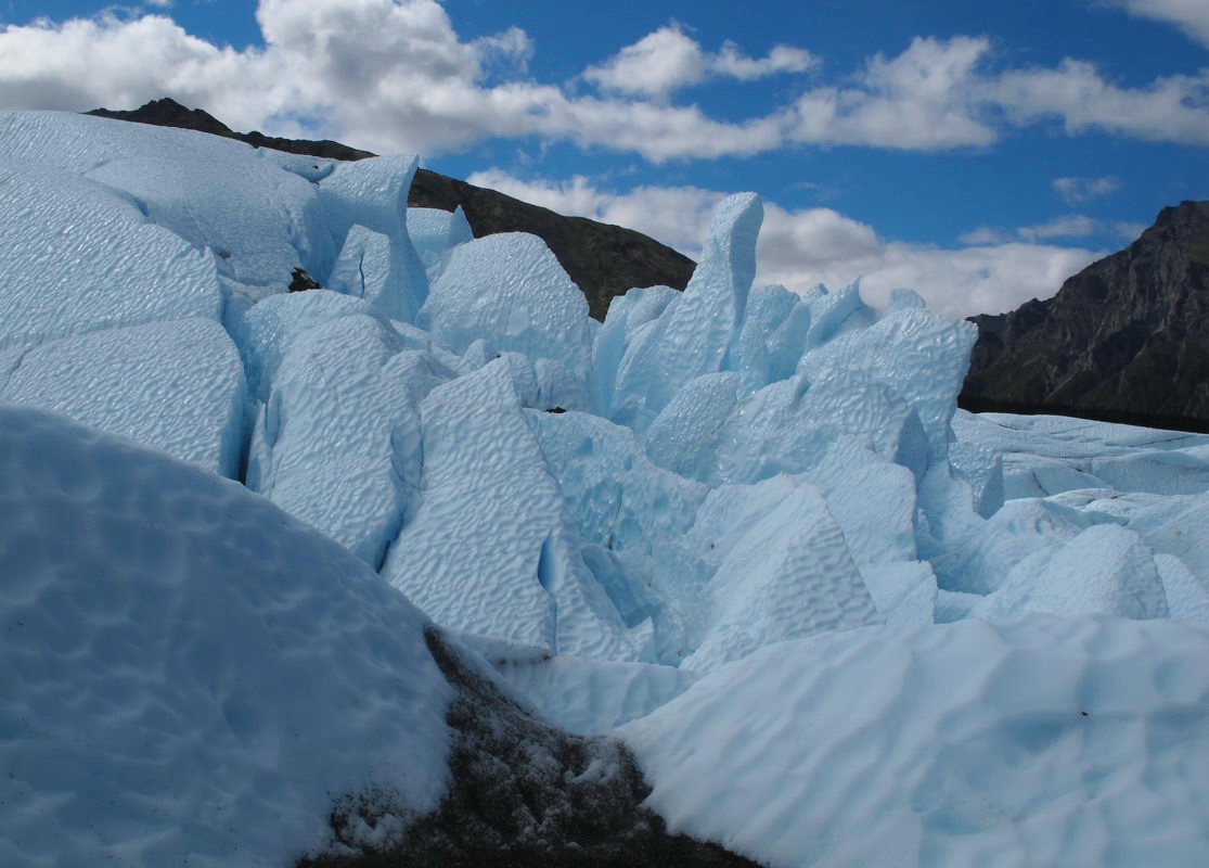 Jokes aside, I now understand that the glacier moves like liquid water. There is so much weight from the ice field above that the solid ice actually flows across the rock. It fractures into huge slabs when it goes over the edge of a cliff, creating what our guides called a frozen waterfall that thrust those beautiful, blue spires high up to the sky. Well, the artist in me would say it’s actually closer to thalo blue with a little cad yellow mixed in. 🙂