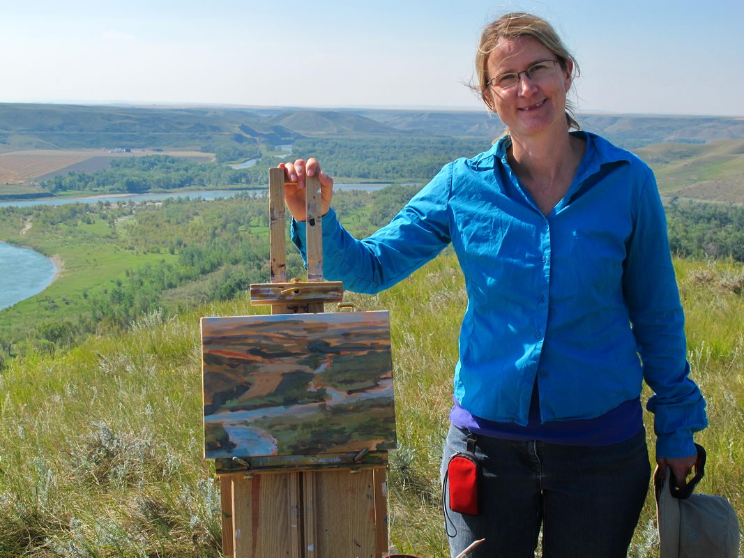 I thoroughly enjoyed painting with Diana, a self-employed artist, who takes advantage of Alberta’s nearby national and provincial parks and Montana’s Glacier National Park as well. In spite of initially setting up on top of an anthill (not a good plan), I loved the subtle intricacies of painting this expansive landscape. Diana shared with me that soon all of the trees along the river will turn a brilliant gold and I’m looking forward to receiving her photo of this spot in all it’s fall glory. Thank you, Diana, for taking the time to show me one of the treasures of Lethbridge. I hope we can re-connect in Waterton National Park later this week – lucky you to live so close!