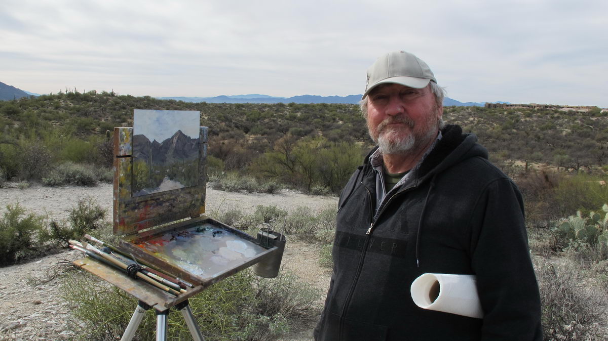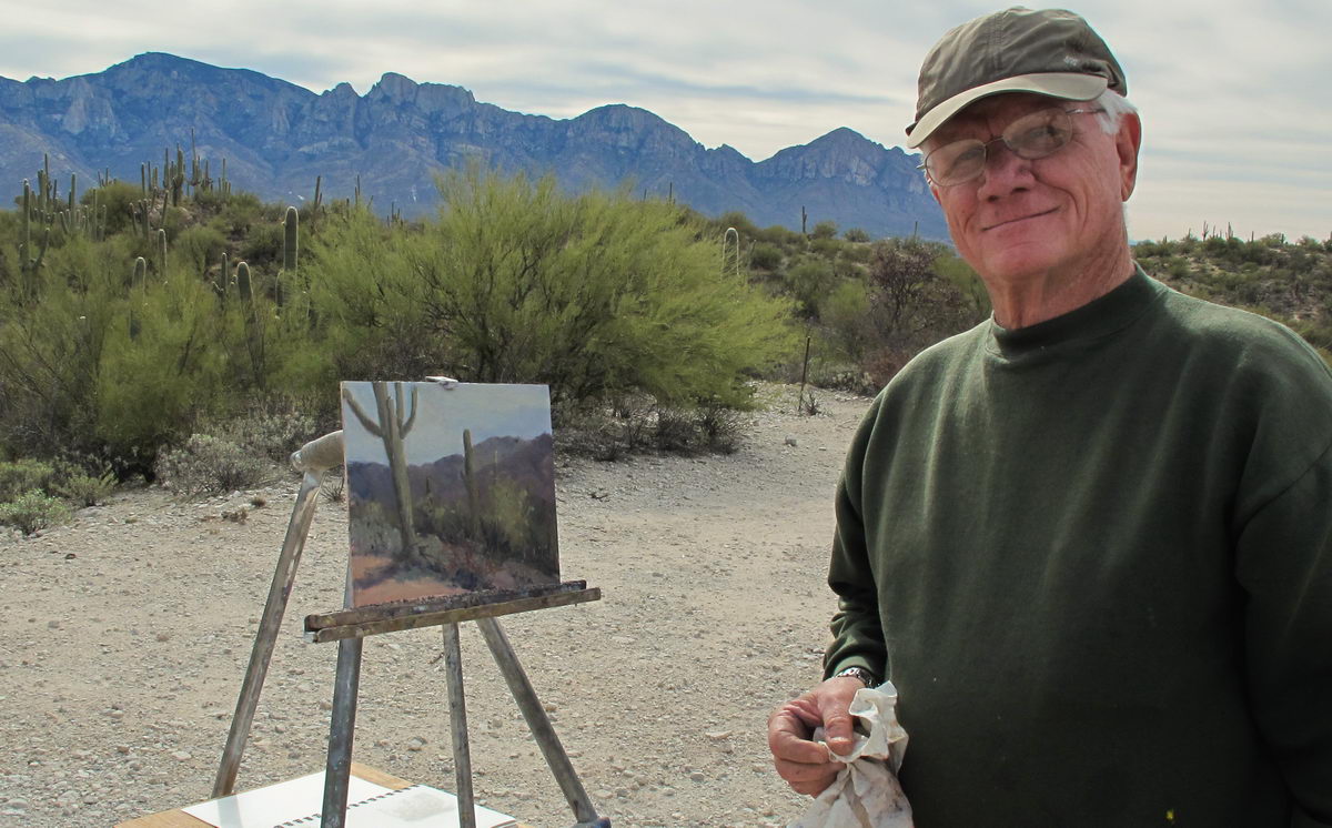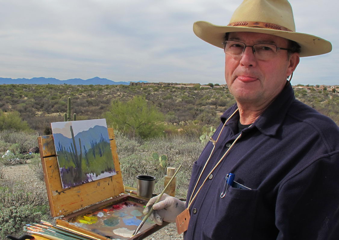 TPAPS member Ron Schlorff called with an invitation to paint along with Pablo de Leon and Norm Sherwood at one of his favorite locations. Honeybee Trail in Oro Valley provides a beautiful, Saguaro-covered overlook to the Pusch Ridge of the Catalina Mountains. Sadly, the predicted sunny day turned cloudy, making the mountains look flat with few shadows. Nonetheless, we had a great time painting and swapping painting experiences.