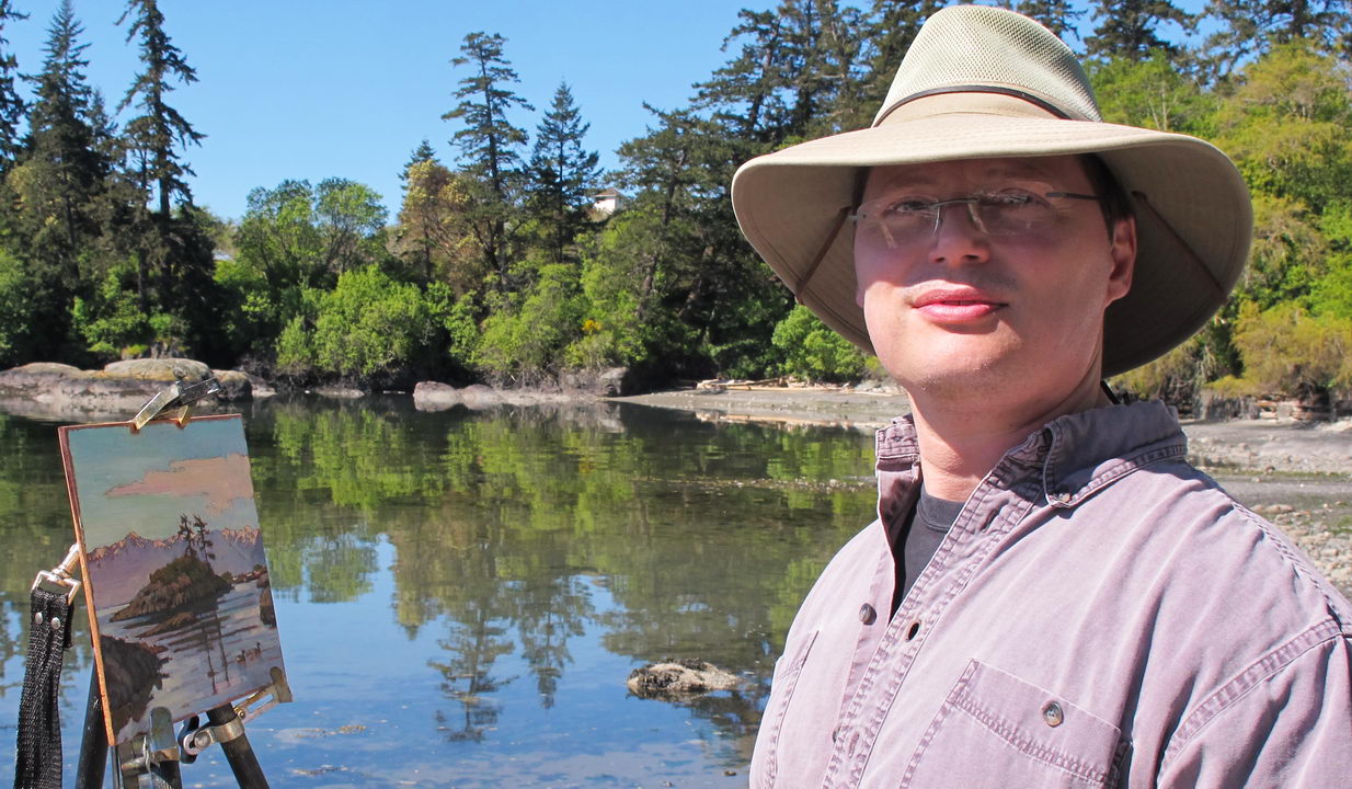 Because Ken Faulk’s aunt and uncle once lived on a beautiful cove called Parry Bay, I enjoyed an outstanding painting site on Sunday. Ken, along with fellow Al Frescoes Desiree Bond and Jim McFarland, met me at 7:30 this morning at a beautiful spot only 10 minutes away from my RV – one I never would have found without Ken’s directions.