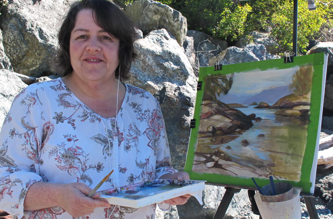The sunny warm morning was just about perfect for painting. We were delightfully entertained by leaping harbor seals smacking their fins on the surface, noisy sea lions, Canada Geese and their new babies, and lots of other birds I didn’t recognize. Desiree mentioned that “pretty much everyone in this area lives about 5 to 10 minutes from the shore.”