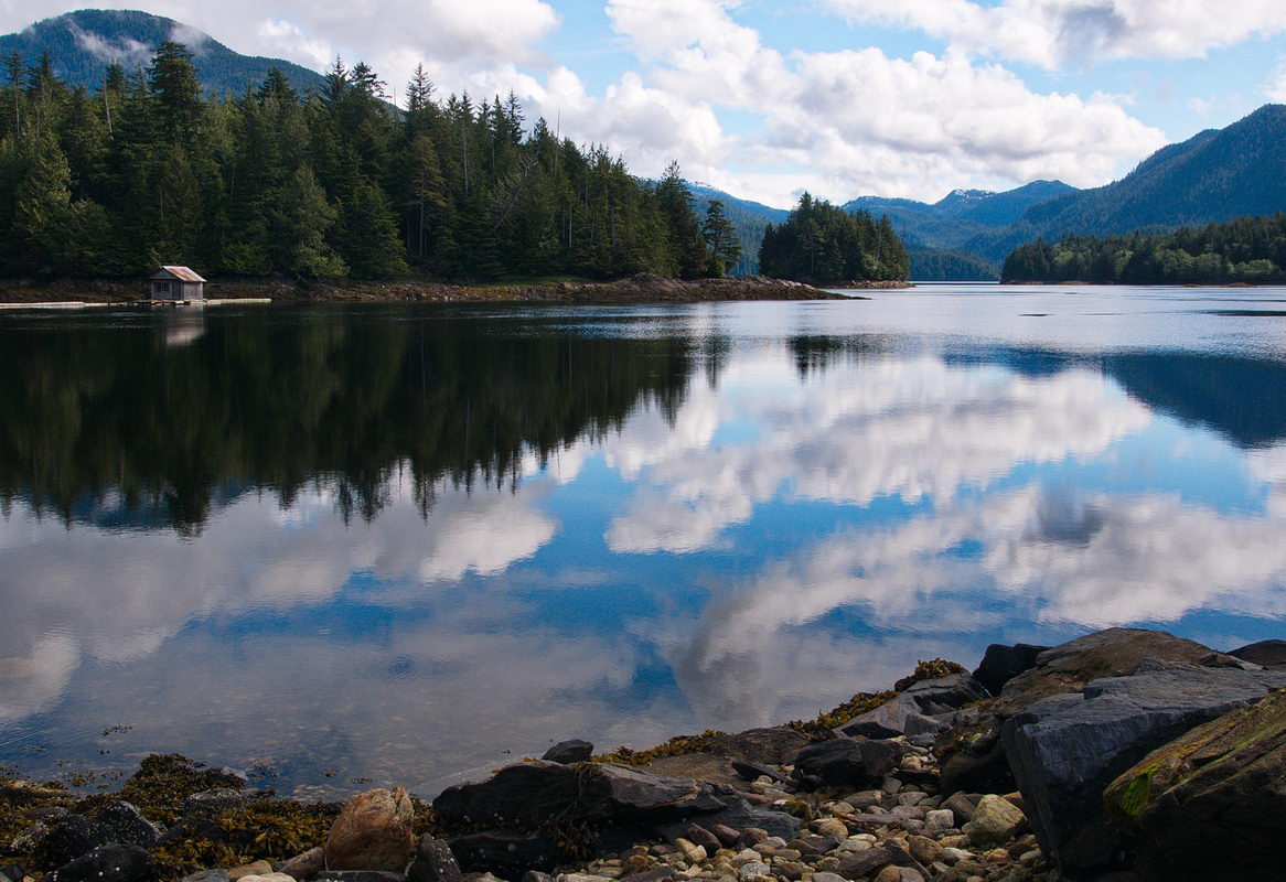 I backed up a bit on the highway—there’s not much traffic at 6:15 am—and bumped my way down a gravel turnout next to the Hecate Strait. At the bottom of the hill I found a small parking lot where locals launch their boats, and quickly set up my easel to catch the play of sky, water and islands.