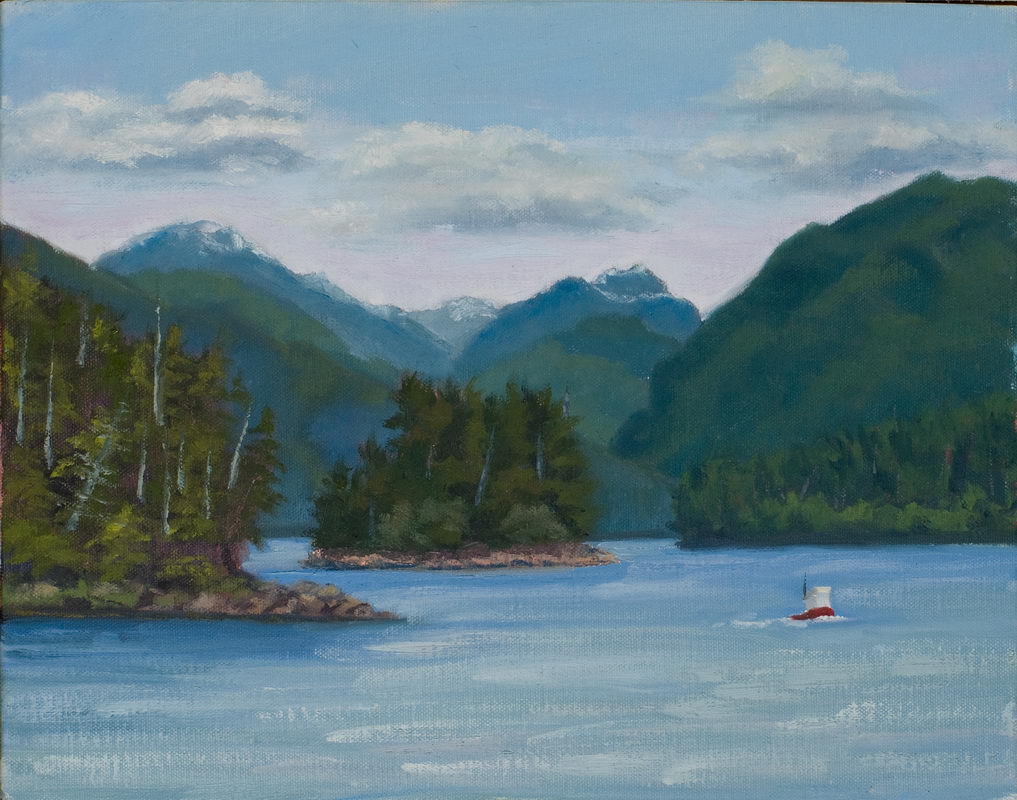 It rained yesterday as we drove the last 60 km of Yellowhead Highway from Terrace to Prince Rupert, obscuring what is rated as one of the most scenic highways in the world. We had barely glimpsed a mountain or two, so I left early this morning intent on driving about 20 miles back to do a painting. Two miles is all I went though, as a wonderful morning sky filled with light and dark clouds and even some blue presented itself over the water. (We artists can be easily distracted, can’t we!)